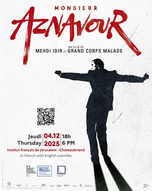 We are delighted to invite you to a special screening of "Monsieur Aznavour" by directors Mehdi Idir and Grand Cour Malade, in collaboration with Roots & Patterns and the French Institute in Jerusalem – Chateaubriand.