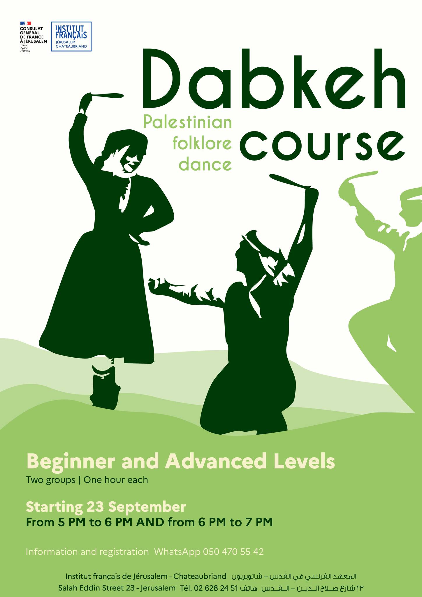 Institut français de Jérusalem - Chateaubriand 23, Salah Ad din street, East Jerusalem, Israel, Po Box 19071, jerusalem, IsraelJoin Our Upcoming Dabkeh Courses!Palestinian Folklore Dance at the French Institute of Jerusalem – Chateaubriand!Every Tuesday | Starting: September 23rdBeginner & Advanced Levels | Duration: 10 classes of 60 minutesFor more information and to register, contact us! WhatsApp: +972 50-4705542Email: [email protected]
