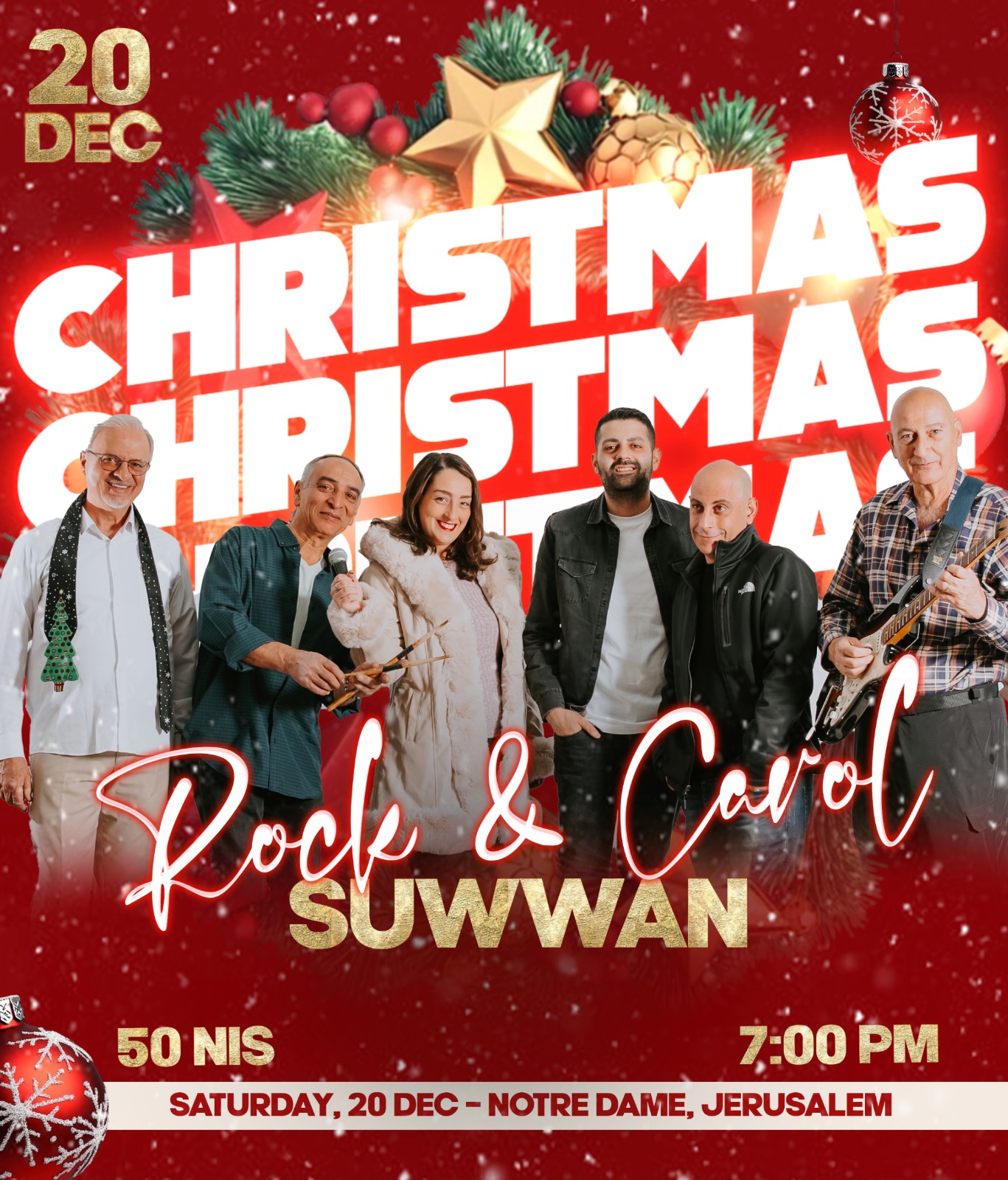 ✨ Rock & Carol — Suwwan ✨ عيد الميلاد هالسنة بصوت أعلى وروح أقوى! 🎸🎄 صوّان رح تشعل مسرح النوتردام بروح الميلاد وأغاني روك فيها نبض الفرح. جهزوا حالكم لليلة موسيقية مختلفة… رح نغني مع بعض ونحس بروح الميلاد. 📅 20 ديسمبر ⏰ الساعة 7 مساءً 📍 مسرح النوتردام – القدس لشراء التذاكر: https://tzkrti.com/ar/events/2974